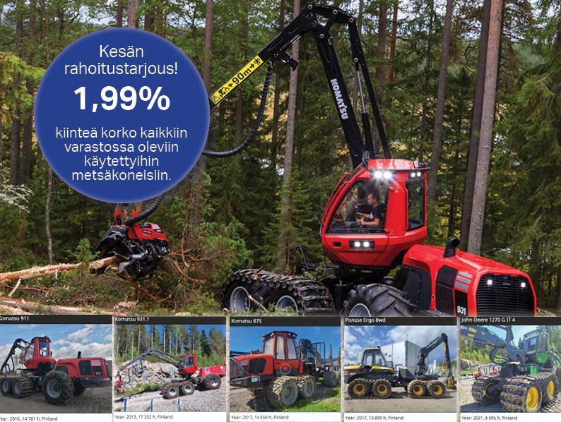 Kampanja koskee kaikkia Komatsu Forestin Suomen varastossa olevia käytettyjä metsäkoneita. Käy katsomassa hyvä valikoimamme täältä ja kysy lisää alueesi Komatsu Forest -myyjältä!